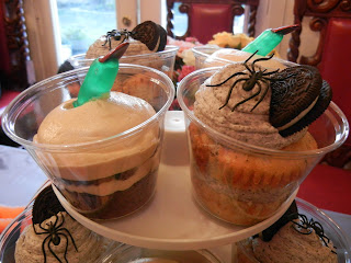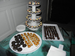 It was Bakingpalooza at my house this weekend! I was asked by my Mom's friend to create a dessert table for about 40 people for a Birthday/Halloween party she was having the day before Halloween. I went over to her house to check out the table that I would be working with and it was ideal for a Halloween party! It looked like it belonged in a haunted mansion along with a creepy wonky-eyed butler that goes around asking people, "Would you like a drink?". It reminded me of that Saved by the Bell episode where "the gang" wins a weekend trip to the murder mystery house. Point of the story: the table was AWESOME!