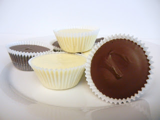I made my way over to my friend Jen's house the other day. I don't like showing up empty handed so I quickly hit the pantry to see what ingredients I had to work with. I quickly noticed that I had bags of chocolate chips that had yet to be used. Those little guys were meant to be used in something other than cookies and I was going to help them reach their fullest potential! For Halloween I bought a bag of Reese's candies and it contained white chocolate peanut butter cups. Since I gave all of my candy away before trying one, I decided now was a great time to make some from scratch!